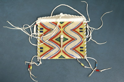 Small Rawhide Bag (Sioux) was hand-crafted from buckskin by Sioux artist V. F. Tuttle. This artwork is part of Beyond Blue Mountains, a collection that was curated by late Tlingit (Native Alaskan) artist Jim Schoppert. It presents the work of Native American artists of diverse heritage, ideas, materials, and styles. The collection takes an in-depth look at the artists’ unique voices and interpretations of tradition.