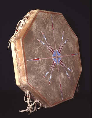 Ceremonial Drum was hand-crafted from buckskin rawhide by Sioux artist V. F. Tuttle. This artwork is part of Beyond Blue Mountains, a collection that was curated by late Tlingit (Native Alaskan) artist Jim Schoppert. It presents the work of Native American artists of diverse heritage, ideas, materials, and styles. The collection takes an in-depth look at the artists’ unique voices and interpretations of tradition.