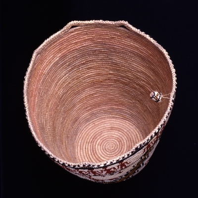 T' at' atiya Basket is part of Native American artist Nettie Kuneki Jackson's body of traditional Klickitat baskets. This basket is an example of "schklup", a type of functional basket made from redcedar that would have been used to collect and store fruit and berries. This artwork is part of Beyond Blue Mountains, a collection that was curated by late Tlingit (Native Alaskan) artist Jim Schoppert. It presents the work of Native American artists of diverse heritage, ideas, materials, and styles. The collection takes an in-depth look at the artists’ unique voices and interpretations of tradition.