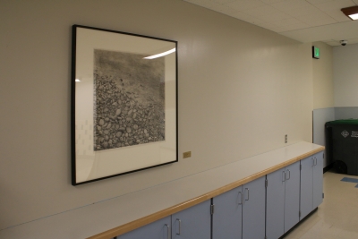 Artist Linda Carlin Gordon created the realistic drawing Columbia Shore. She based the imagery on the Columbia River shoreline at a park in Richland, Southeastern Washington.