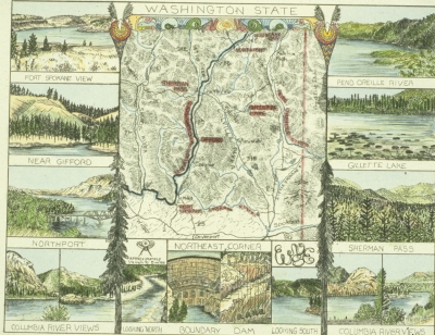 After a 3,000 mile excursion over a two-and-half year period, artist Nance Bracken created this artwork as part of an eight-piece set, featuring the eight regions of Washington State. Each artwork of a region includes an etched and hand-painted map of the area, which is surrounded by images of its key features as interpreted by the artist. This one is for the Northeast Corner of Washington State and features lake, rivers, and pine forests, as well as the Boundary Dam.