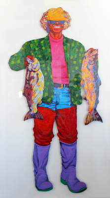 Artist Melinda Thorsnes created the brightly colored painting Kodiak by cutting the silhouette from wood using a sabre saw. She notes, "It represents the pride of the sportsman in his quest to return to nature and triumph. Its cut-out format brings the viewer in closer contact with the man himself by deleting other frames of reference."