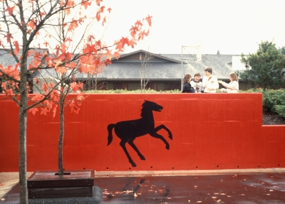Artist Joan Brown created the playful imagery and rich color of her Black Mustangs mural as a meeting place for students.